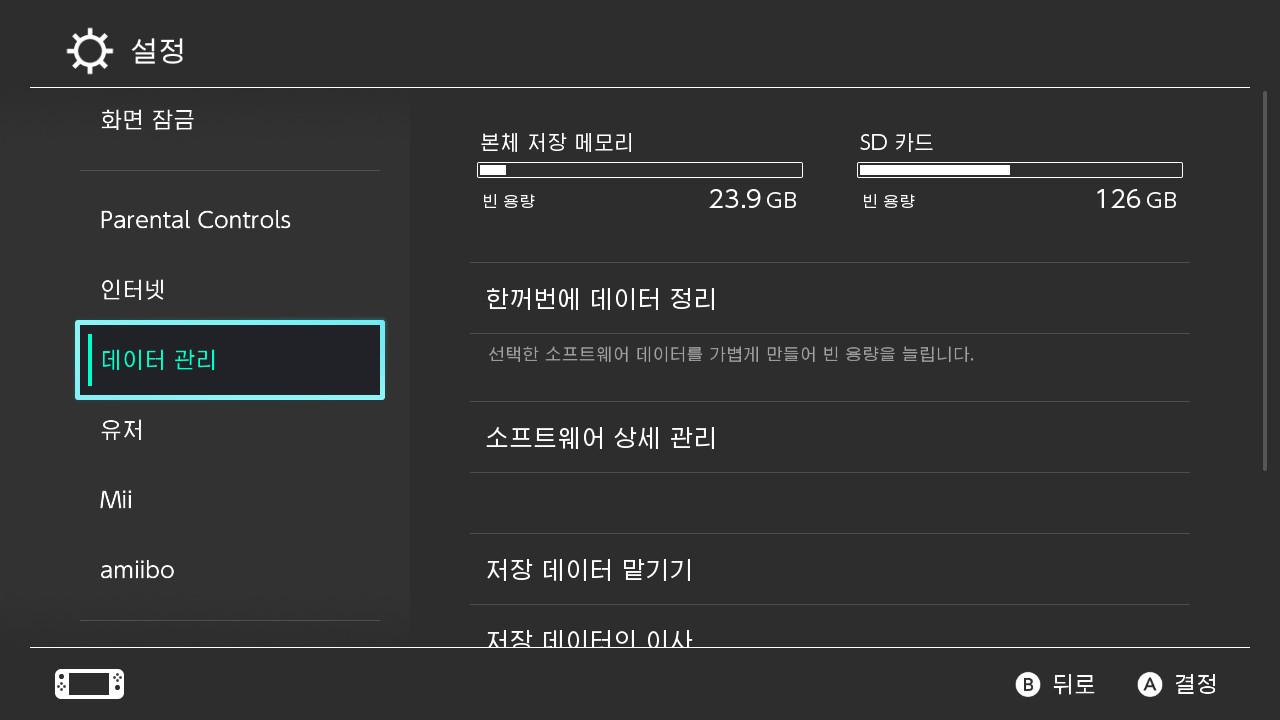 [저장데이터 설정]과 [너굴보털 설정]에 대해 볼 수 있는데요, 우리는 [저장 데이터 설정] 부분을 보면 됩니다.