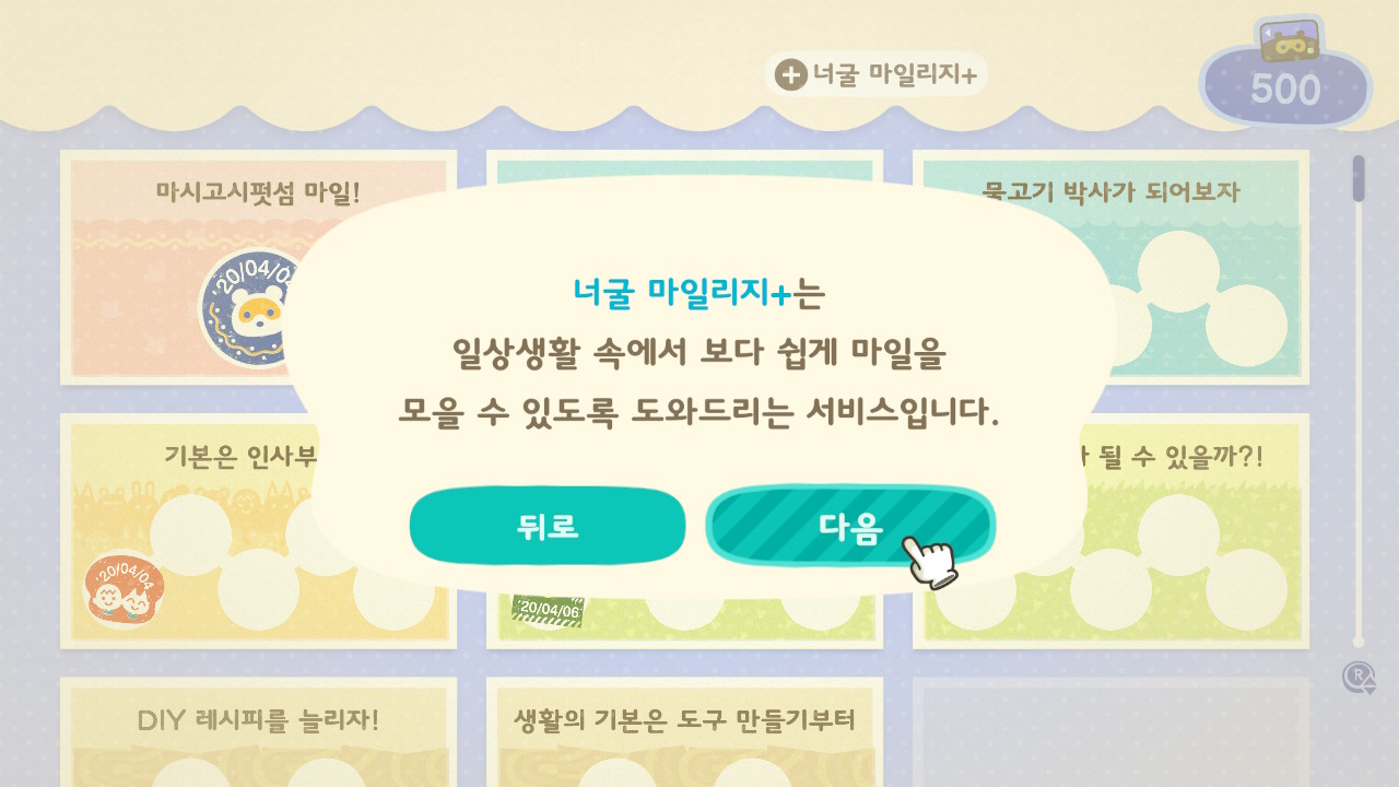 텐트 생활을 벗어나, 집을 세우게되면 이제 너굴 마일리지+ 서비스를 이용할 수 있다고 합니다.