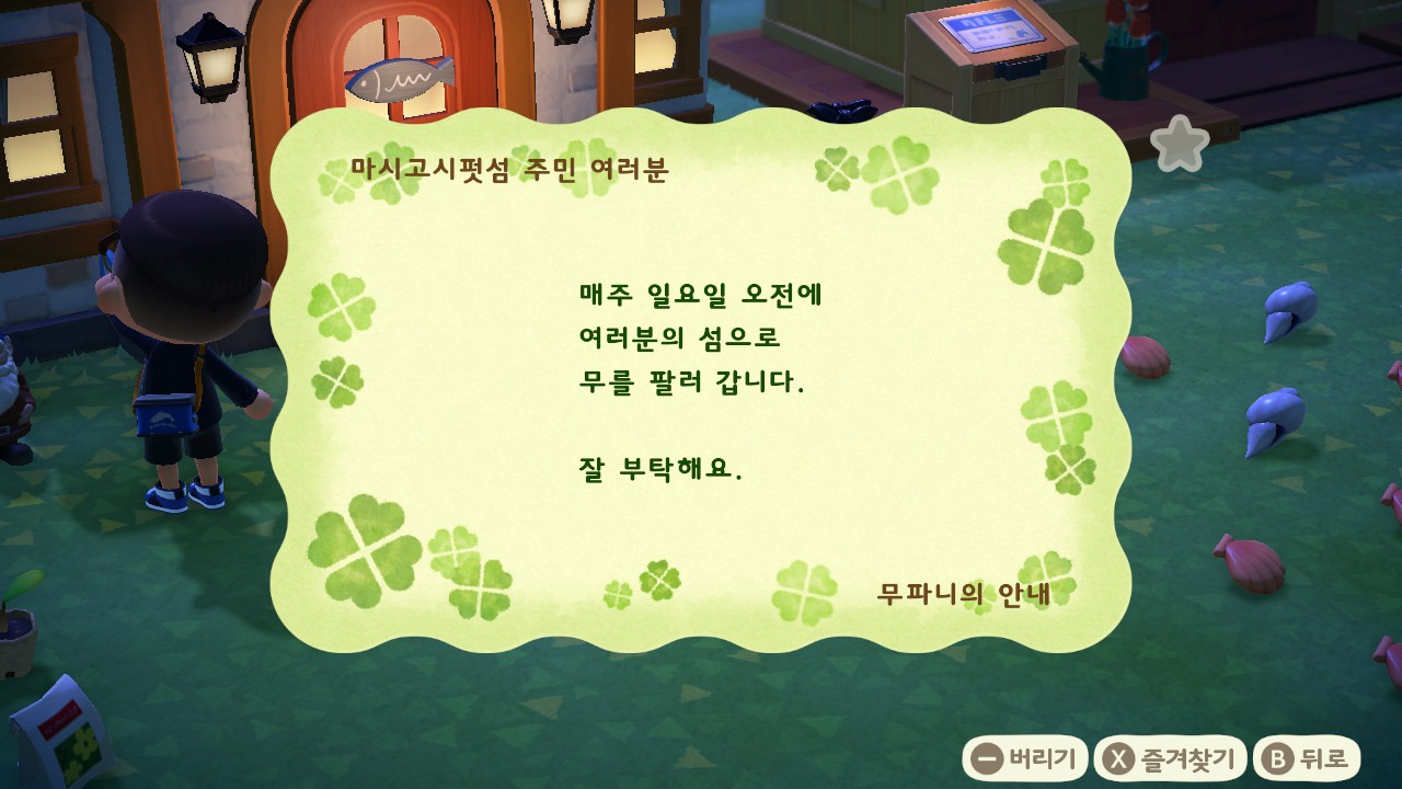 우선 이런저런 파밍을 다니면서 줍게되는 조개와 잡초는 너굴상점 앞에 그대로 떨궈주세요.